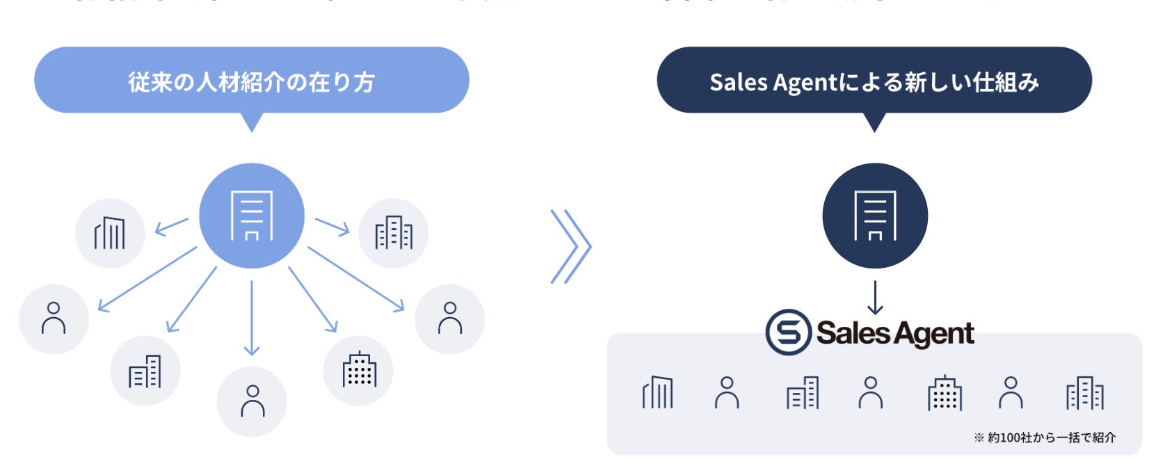 また、従来は下図にあるように、複数の紹介会社からの紹介の場合は個別に管理をしなければならず、多くの企業様の悩みの種となっていましたが、sales agentでは、独自開発のシステムで一元管理が可能!さらに、複数の紹介会社との情報交換が必要ないため、大幅に業務改善・効率化が可能です