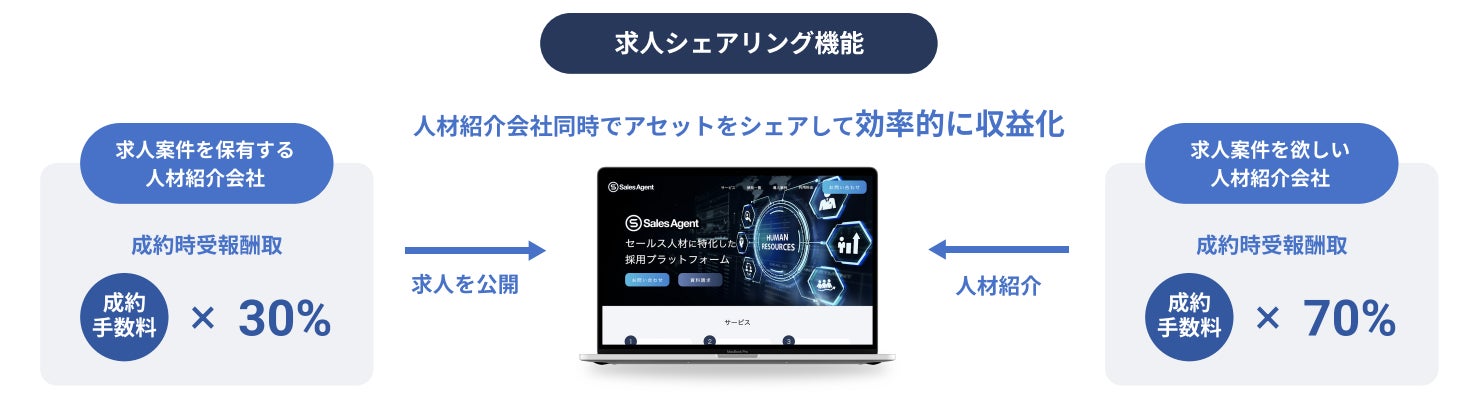 さらに、sales agent独自のシェア求人機能で自社の求人で中々紹介があげられていない企業への送客支援を実現し、取りこぼしのない売上を実現する事ができます。
